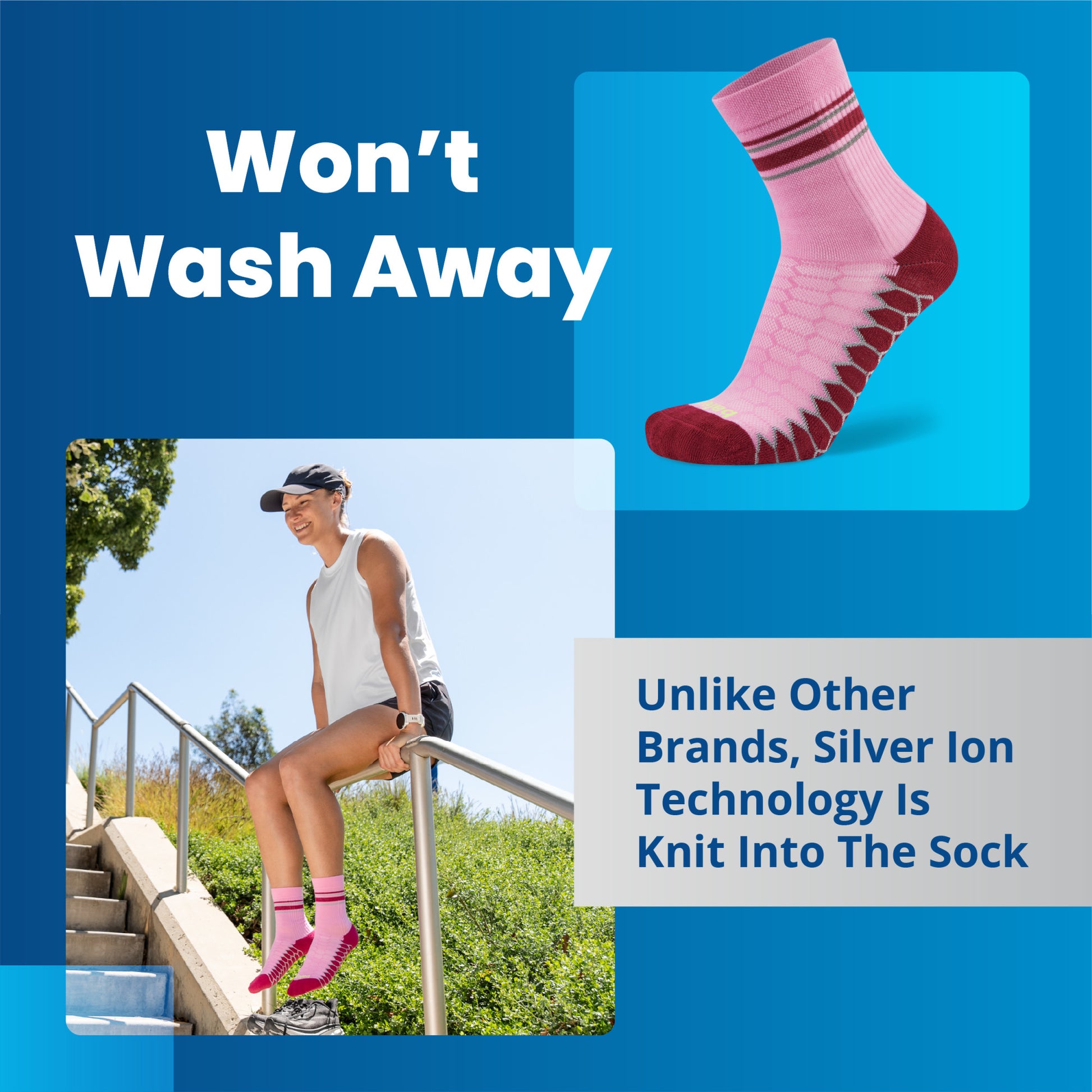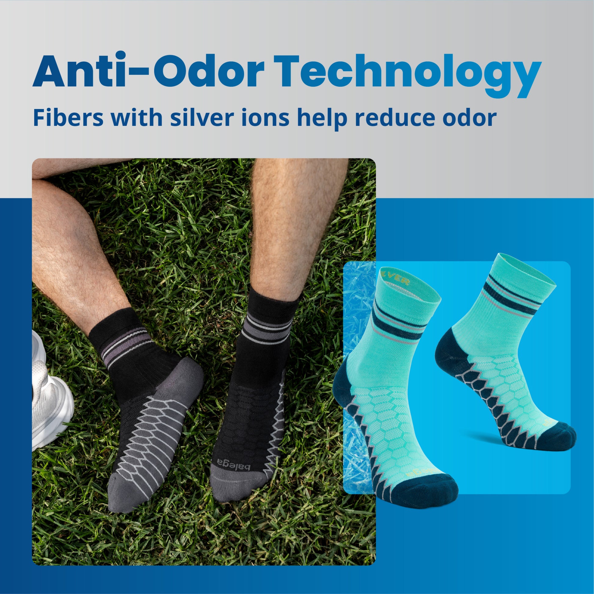 - Provides lasting antibacterial running sock performance with fibers encapsulated in Silver ions.